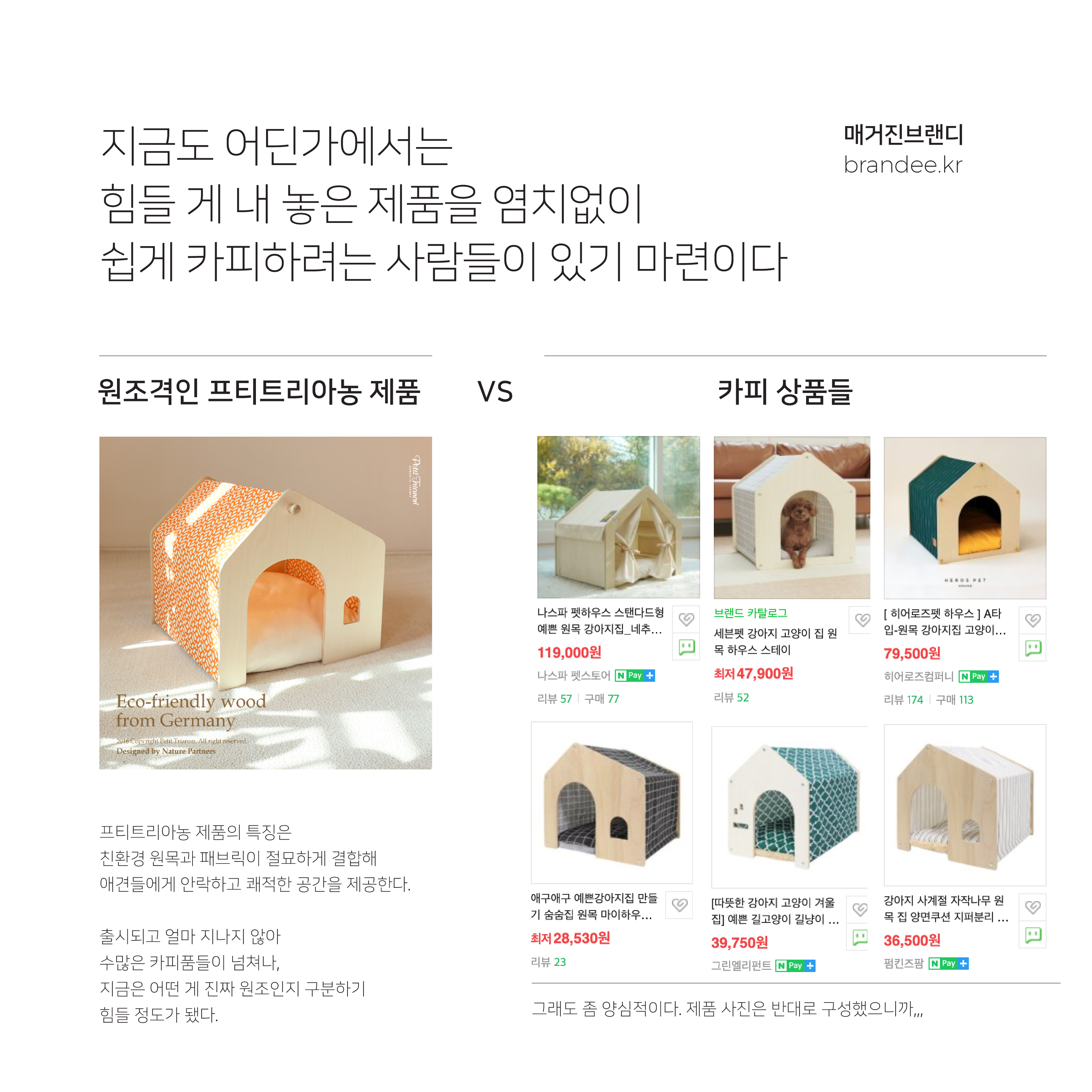 지인 중에 친환경 목재로 강아지집을 만드는 분이 계신다. 시장 초반에는 네이버 쇼핑에서 독보적인 위치에 있었는데, 어느 순간 카피품들이 넘쳐나 지금은 진품이 어떤 건지 모를 정도로 시장이 혼란에 빠져 버렸다. 다행이도 강아지집 단 하나의 히트 상품에 목메지 않고 친환경 목재를 활용한 용품들로 상품을 확장해 아이들 가구나 캠핑 용품들까지 만드는 토탈 가구 브랜드로 확장해 그 고비를 넘겼다. 한 상품이 카피품때문에 시장에서의 지위를 한 순간에 잃었을 때를 대비한 현명한 대안이었다. 시간이 지날수록 상품에 신뢰가 쌓이고 우호적인 리뷰가 쌓이자 그것들이 모여 브랜드의 스토리가 됐고 덕분에 이제는 사업이 어느 정도 안정적인 궤도에 올라 왔다. 상품으로써가 아니라 브랜드로써 생존할 수 있는 구조를 만드는 일이 그래서 중요하다.