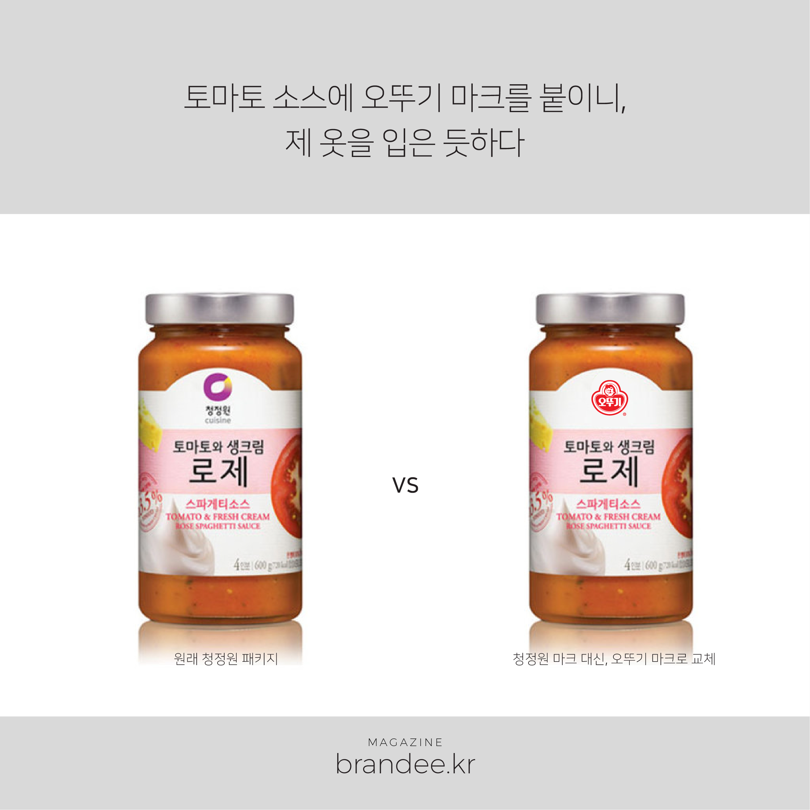 그렇다면 전통차제품이 아니라, 파스타소스에 붙은 오뚜기, 청정원의 마크를 비교해보면 어떨까. 유차차에 붙어 어색한 웃음을 띄고 있던 얼굴과는 다르게 너무 편하하게 어울리는 얼굴로 우리를 반기는 마크로 변했다. 더구나 적용해 본 소스는 토마토라 그런지 원본인 청정원 마크보다 더 어울리는 것처럼 보이기도 한다. 아무래도 오뚜기=케찹이라 인식에서 오뚜기=소스라는 등식으로의 인식 이동은 별로 어렵지 않았을 것이다. 색도 비슷하고 점성이나 식감에서도 차이가 별로 크지 않은 음식이니까 말이다.