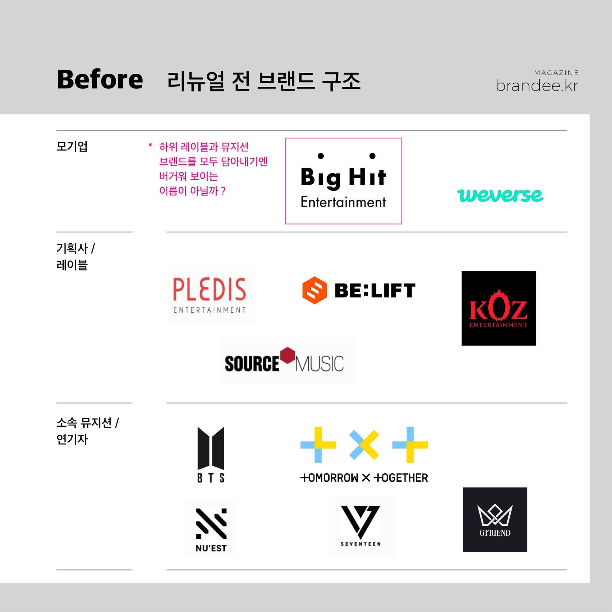 SM, YG, JYP로 사명을 지었을 때 이런 것까지 어느 정도 염두해 두지 않았을까도 싶다. 그에 비해 BigHit의 이름은 거기까지는 생각하지 못했던 것 같다. 산하의 레이블이 이렇게나 많아지고 사업 영역도 전세계를 상대로 할지 상상이나 했을까? 어쨌든 이름 때문인지 ‘빅히트’한 그룹이 나온 건 성공적인 브랜딩이다.